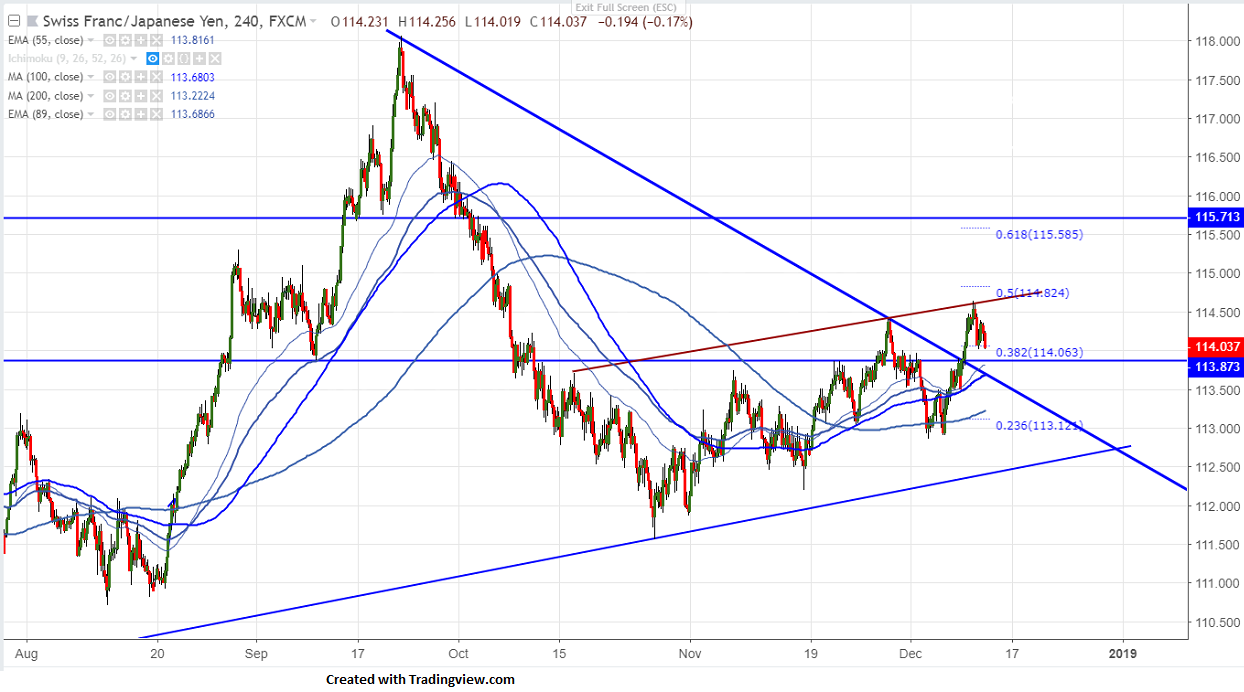 CHFJPY is trading higher for 4th consecutive day from the low of 112.89. The pair hits high of 114.63 and shown a minor dip. It is currently trading around 114.22.