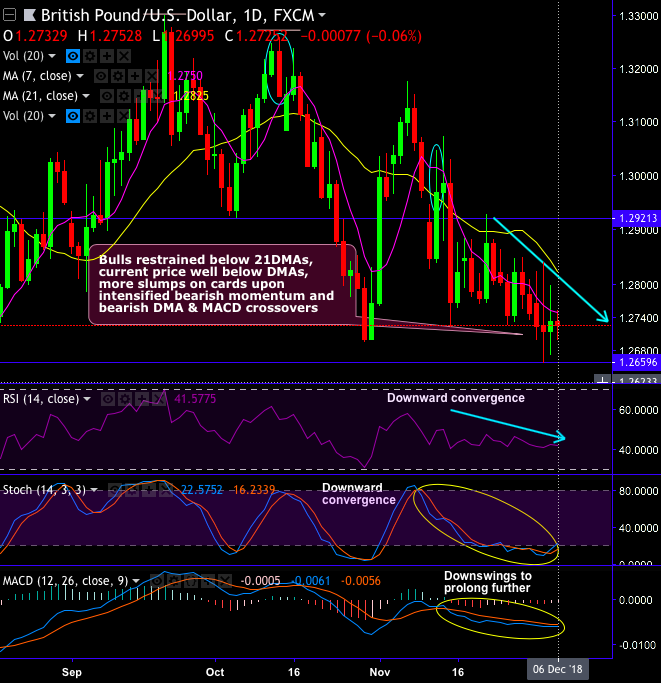 On daily trading grounds, at spot reference: 1.2731 levels, we advocate buying boundary binary strategy, using upper strikes at 1.2797 and lower strikes at 1.2697 levels. The strategy is likely to fetch leveraged yields as long as the underlying price remains between above strikes on the expiration.