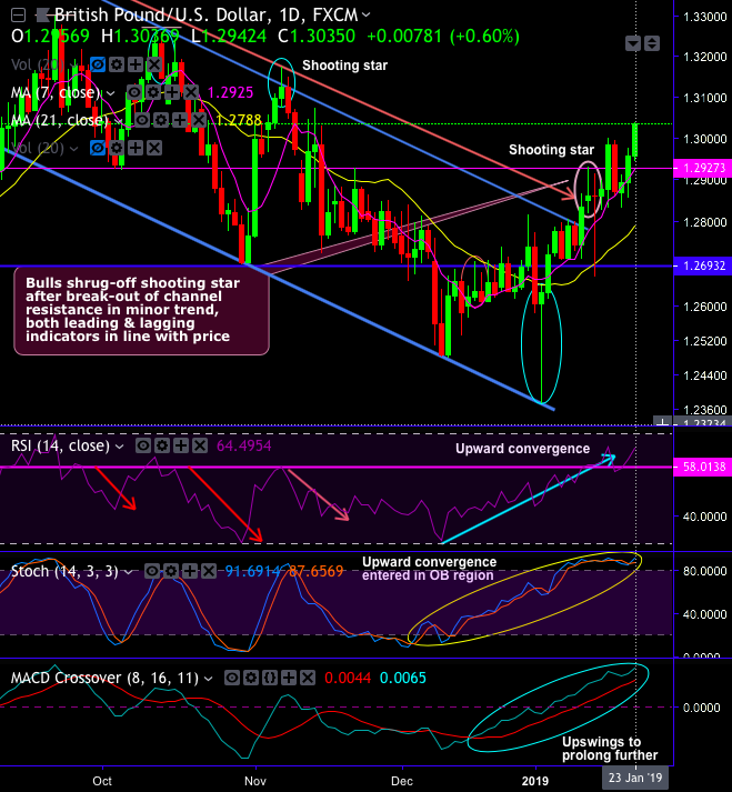 Trade tips: On trading perspective, at spot reference: 1.3031 levels, contemplating above explained intraday technical rationale, it is advisable to trade one-touch call option strategy using upper strikes at 1.3054, the strategy is likely to fetch leveraged yields as long as underlying spot FX keeps spiking further up to upper strikes on the expiry duration.