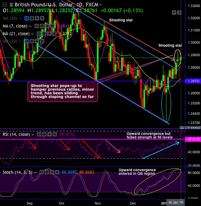 Technical chart and candlestick patterns of GBPUSD (cable): Shooting star patterns pop up at 1.2861 and 1.3755 levels on daily and monthly plotting respectively, consequently, the minor trend attempted to slide below DMAs, while the major downtrend has constantly been sliding below EMAs.
