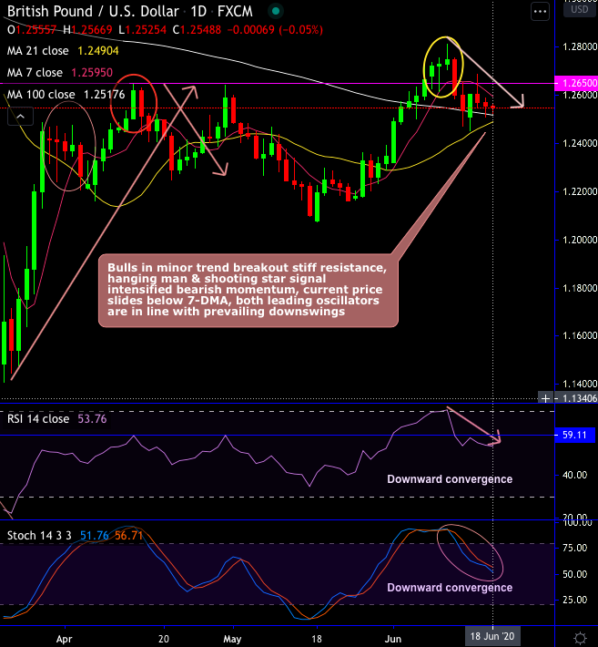 Prior to which, bulls in minor trend breakout stiff resistance, hanging man & shooting star signal intensified bearish momentum, current price slides below 7-DMA, both leading oscillators are in line with prevailing downswings.