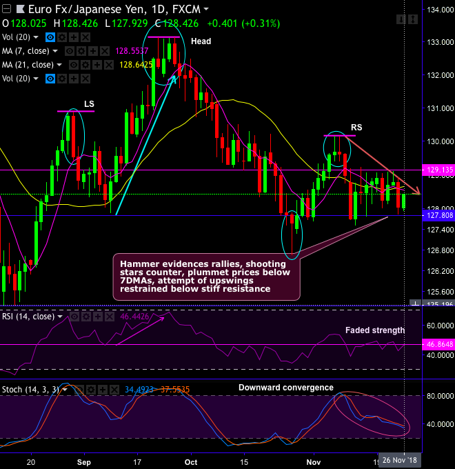 Trade tips: On trading perspective, at spot reference: 128.452 levels, it is advisable to snap any abrupt rallies and bid tunnel put option spreads, use upper strikes at 128.6437 and lower strikes at 127.929 levels, the strategy is likely to fetch leveraged yields as long as the underlying spot FX keeps dipping further until expiration.