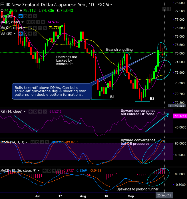Chart and candlestick pattern: NZDJPY forms gravestone doji and shooting star 75.174 and 74.904 levels. Double bottom pattern, with bottom 1 at 72.353 and bottom 2 at 72.254 levels (refer daily chart).
