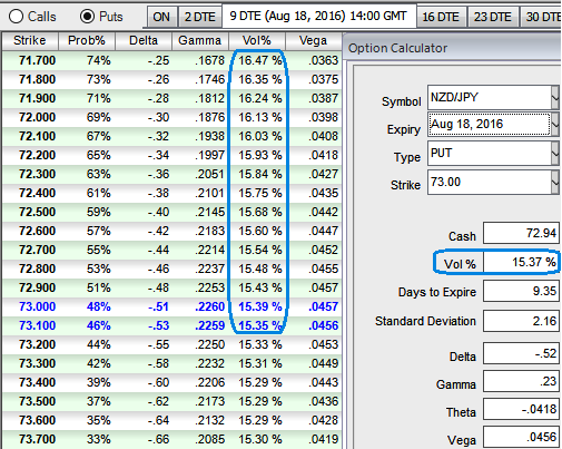 1W ATM IVs are trending higher at 15.37% which means the FX market thinks the price has the potential for large movement in either direction during RBNZ’s monetary policy season, but you can observe higher vols and probabilistic flashes as the put contracts drift towards out of the money strikes.