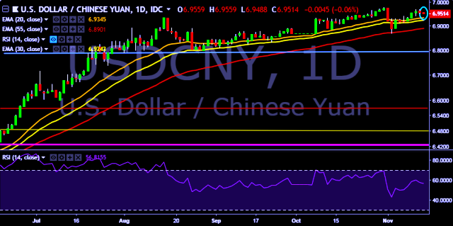 We prefer to take long position on USD/CNY only above 6.9570, stop loss at 6.9320 and target of 6.9768.