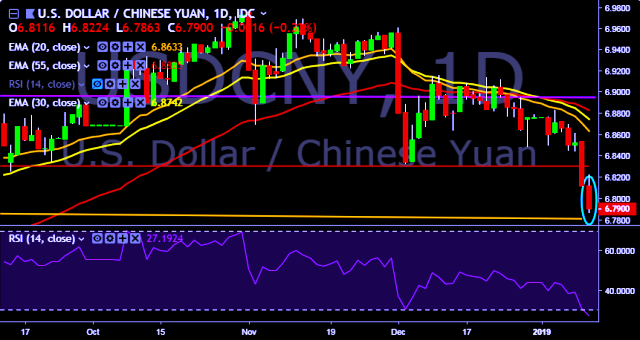 We prefer to take short position on USD/CNY around 6.7950, stop loss at 6.8210 and target of 6.7412.