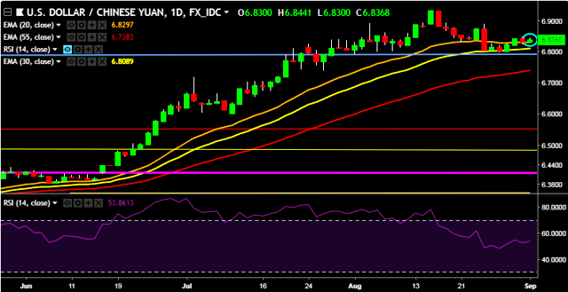 We prefer to take long position on USD/CNY only above 6.8470, stop loss at 6.8300 and target of 6.8774.