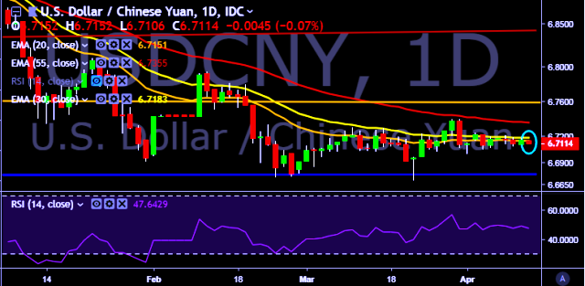 We prefer to take short position on USD/CNY only below 6.7060, stop loss at 6.7250 and target of 6.6853/6.6650.