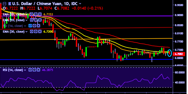 We prefer to take short position on USD/CNY around 6.7150, stop loss at 6.7250 and target of 6.6853.