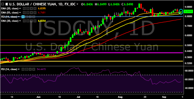 We prefer to take long position on USD/CNY around 6.8440, stop loss at 6.8220 and target of 6.8656/6.8792.