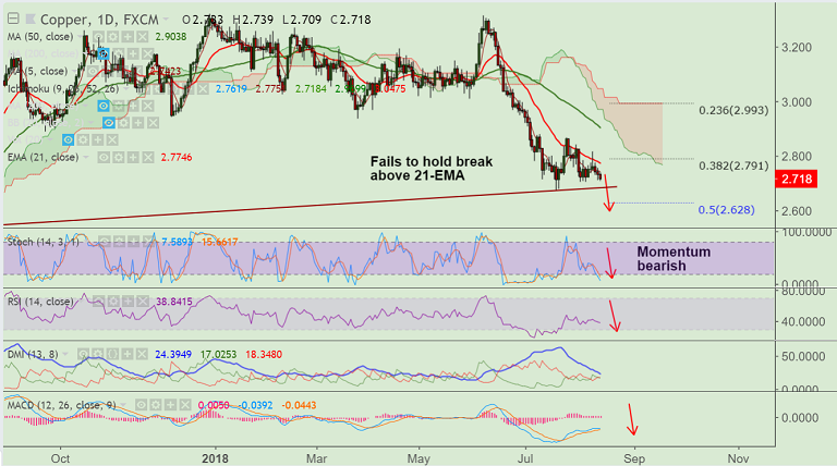 - Copper struggles to hold break above 21-EMA, edges lower for the 3rd straight session.