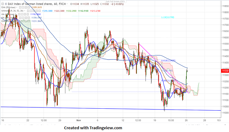 DAX is trading higher and jumped more than 200 points from low of 11000. The index has formed a temporary top of 13600 and lost more than 2500 points following foot steps of Wall Street. DAX has formed almost a double bottom at 11000 and any major weakness only below that level. It is currently trading around 11344 (1.54% higher).