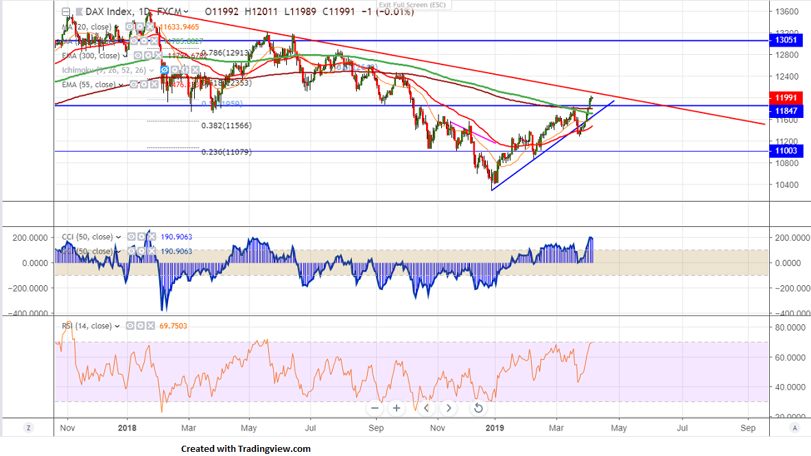 DAX is in bullish phase after a massive 330 points sell-off from major top 13601 made on Jan 23rd 2019. The index has halted its major weakness on Dec 27th and started to show a good jump of nearly 1800 points. The jump was mainly due to strong US markets and easing US-China trade tensions. The index hits high of 12035 and is currently trading around 12000.