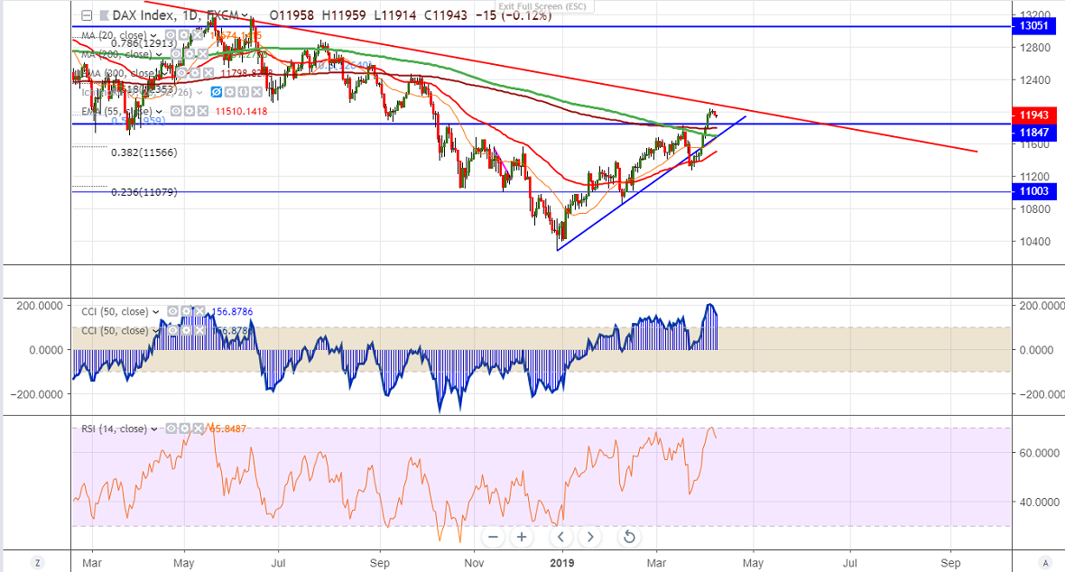 DAX has halted its 10 days of winning streak. The index hits high of 12025 and lost nearly 100 points from the high. The slight decline is due to profit booking.DAX was in bullish phase after a massive 330 points sell-off from major top 13601 made on Jan 23rd 2019. The index has halted its major weakness on Dec 27th and jumped nearly 1800 points. The jump was mainly due to strong US markets and easing US-China trade tensions. US has proposed tariffs to EU goods worth USD11bn. It has increased fears of trade war between US and EU. Markets eye ECB monetary policy meeting tomorrow for further direction. Investors expect ECB to be more dovish and there will not be much changes in policy.The index hits high of 12035 and is currently trading around 11955.