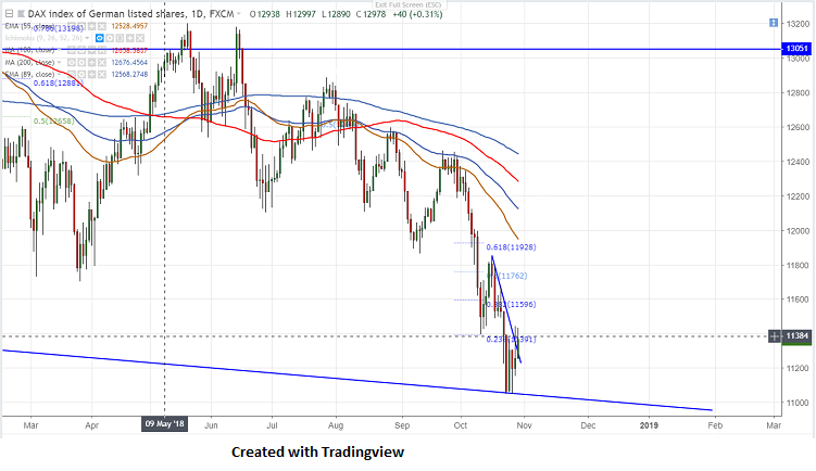 DAX index has bottomed out at 11050 and shown a minor jump of 400 points. The index was in selling mode for past four months and declined more than 2000 points from minor top made on 13179 made on Jun 14th 2018. It hits high of 11443 and is currently trading around 11412.