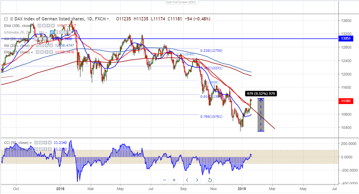 DAX30 has jumped sharply on Friday following footsteps of US markets. US markets closed higher for 4th consecutive weeks on US-China trade hopes and jumped nearly more than 14% from low made on Dec 26th 2018. DAX formed a minor bottom around 10281 and shown a massive recovery of more than 9.50%. It hits high of 11260 and is currently trading around 11186.
