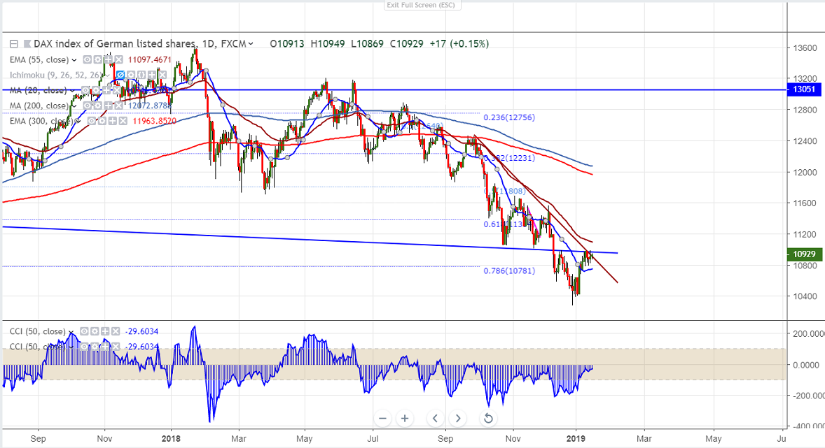 DAX30 is trading in narrow range for past four trading session between 10977 and 10792. The index was holding above 20-day MA despite Brexit uncertainty.The House of Common rejected May Brexit deal 432 to 200 was more severe than anticipated and this has opened possibility of a no- deal Brexit. The index jumped nearly 6.75% from low of 10281 and lost more than 1.5% from high of 10977 . It is currently trading around 10927.