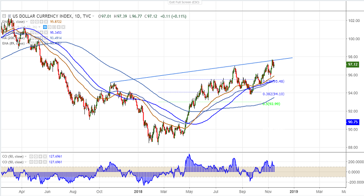 DXY has formed a temporary top around 97.69 and shown a 100 pips decline till 96.77 The index has taken support near 10 day MA and shown a good recovery. It is currently trading around 97.15.
