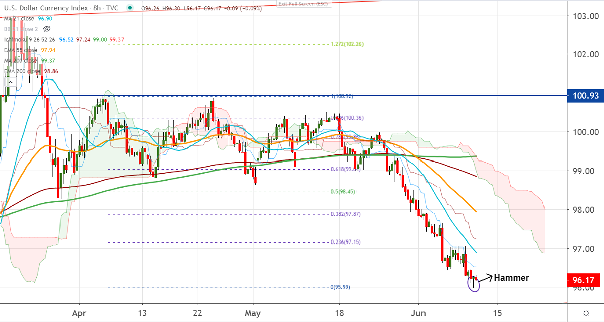 US Dollar index recovered slightly for the day from a 3-month low of 95.98. The overall is trend is slightly neutral and major weakness can be seen only if it breaks 95.85 (200-W EMA). Markets eyes the US fed monetary policy which is to be released today for further direction. U.S CPI came at -0.1% m/m slightly worse than expected 0.0%.