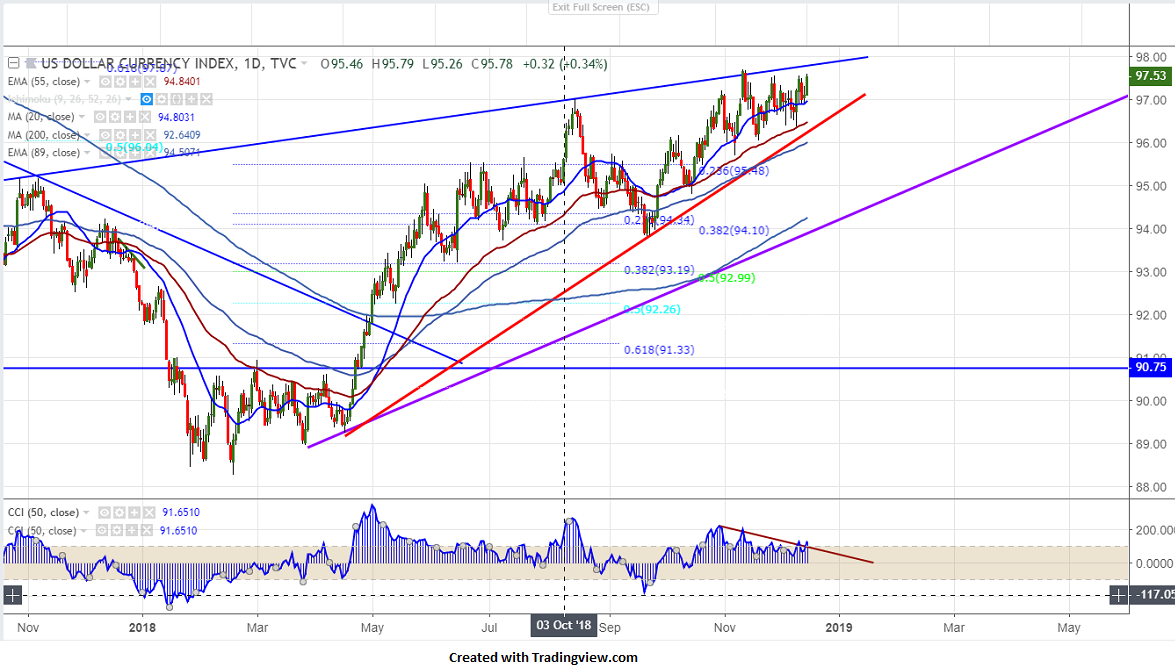 The major trend line resistance is around 97.70 and any further bullish continuation only above that level. Any break above 97.70 will take the index to next level till 98/98.60.