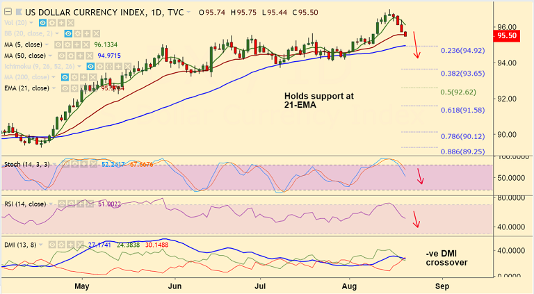 Resistance levels - 95.57 (21-EMA), 96.13 (5-DMA)