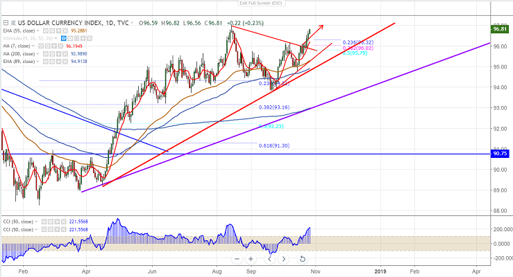 The index is trading steady for fifth consecutive day and hits high of 96.79 at the time of writing .It is in bullish phase and major sell-off in global stock market is upporting US dollar index. It is currently trading around 96.76. Short term trend is bullish as long as support 96 (7- day MA) holds. Markets eye US GDP data.