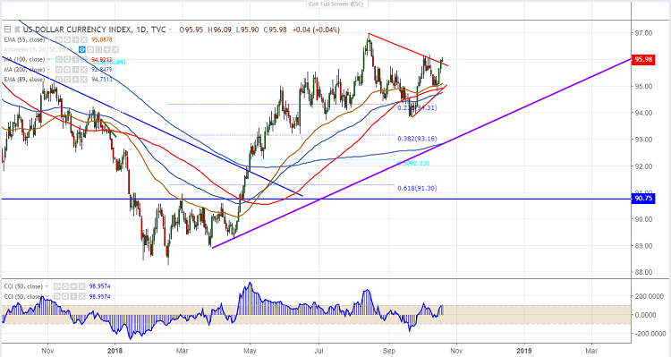 DXY recovered more than 50 pips from the low of 95.49. USD prices has been support due to hawkish Fed rates and trade war tensions. The index hits high of 96.09 and shown a minor decline till 95.95. it is currently trading around 95.97.