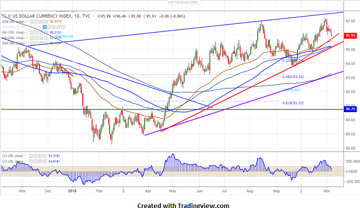 The near term support is around 95.90 and any violation below will drag the index till 95.56 (55- day EMA)/95.20 (100 -day MA).