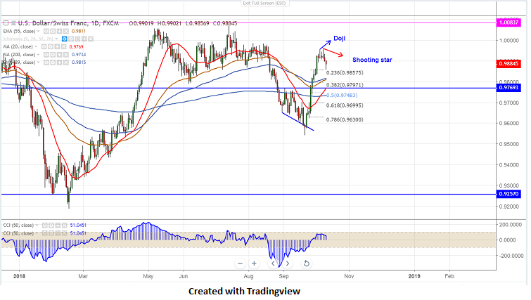 USDCHF was consolidating in narrow range after massive recovery from low of 0.95421. The pair hits high of 0.9955 and shown a minor decline of more than 50 pips today on account of geo political tensions in Italy and trade war worries between US and China has increased demand of safe haven currencies like Yen,Swiss franc. The pair hits low of 0.9855 and is currently trading around 0.98821.