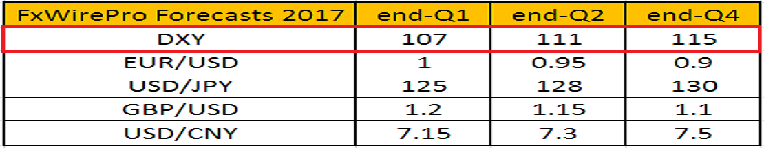 The United States dollar index likely to continue its post-Presidential election merriment even in 2017. We foresee that the dollar index (DXY) will jump above 107 by the first quarter and break April 2002 high of 115 by the end of next year.