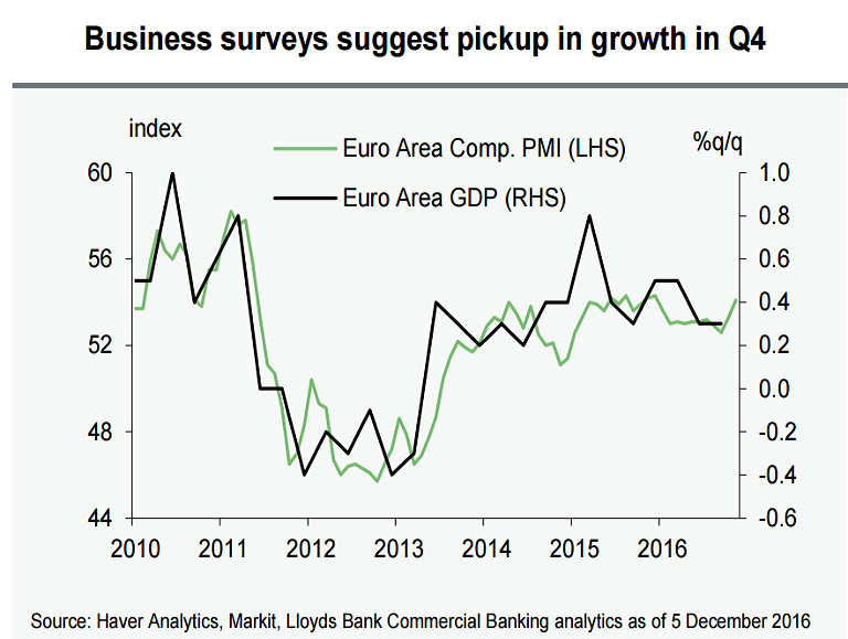 The overall euro zone economy is developing largely as expected since the release of its September forecasts and surveys have been reasonably buoyant heading into the fourth quarter. Data published by Markit Economics on showed on Monday signs of steady fourth quarter growth and indications that eurozone inflationary pressures are rising. Unemployment dropped to the lowest level in seven years in November and manufacturing activity accelerated.