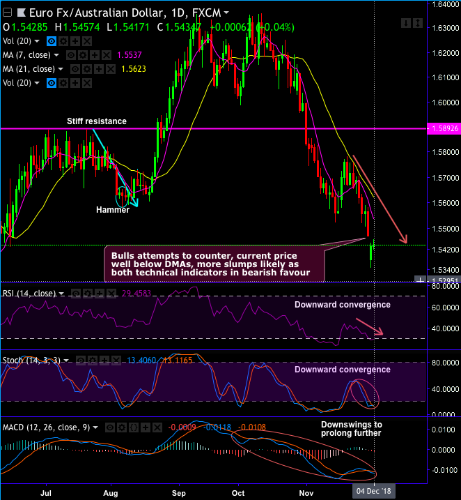 From last two days, EURAUD bulls attempt to counter gap down formation, upswing seems unlikely to prolong as both leading and lagging indicators are not in conformity to the prevailing bullish rallies (refer monthly chart).