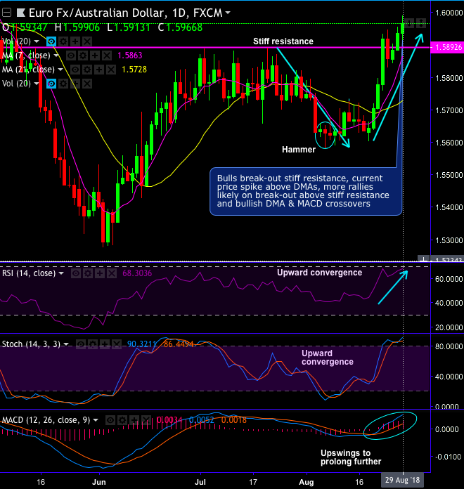 EURAUD has constantly been spiking from last three days, amid this bullish rout it has broken stiff resistance at 1.5892 levels, bullish sentiments are intensified as the current prices have gone well above DMAs (refer daily charts).