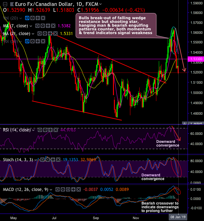 Trade Tips: Ahead of BoC monetary policy that is scheduled for this week, contemplating above technical rationale, at spot reference: 1.5196 levels, we advocate initiating shorts in EURCAD futures contracts of Jan’19 delivery and simultaneously, add longs in futures of Mar’19 delivery. Thereby, one can directionally position in their FX exposures. The directional implementation of the same trading theme by further allow for a correlation-induced discount in the options trading also if you choose strikes appropriately.