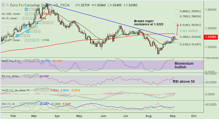 - EUR/CAD has broken strong trendline resistance at 1.5225, bias higher.