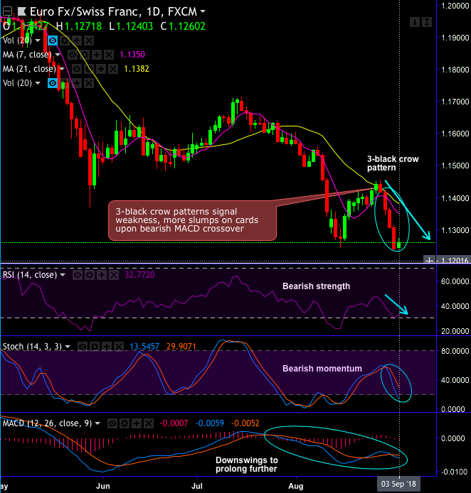 EURCHF forms 3-black crow pattern which is bearish in nature. This pattern has occurred at 1.1239 levels that signal weakness.