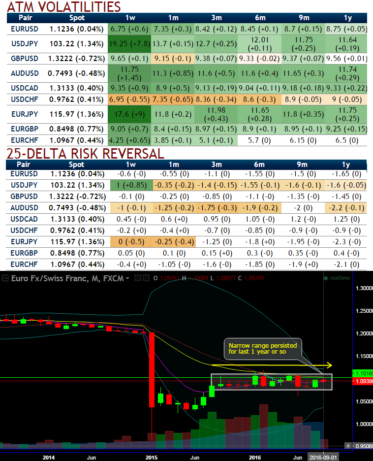 Rationale: EURCHF’s range bound pattern is still persisting during lower IV situations but some bearish candles are indicating slight weakness on both weekly and monthly charts, (Ranging between upper strikes 1.1128 and lower strikes at around 1.0725 levels.