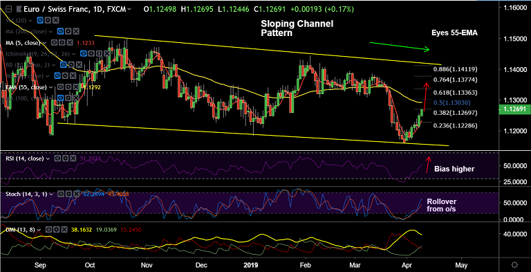 Recommendation: Good to go long on break above 38.2% Fib, SL: 1.1250, TP: 1.1290/ 1.13