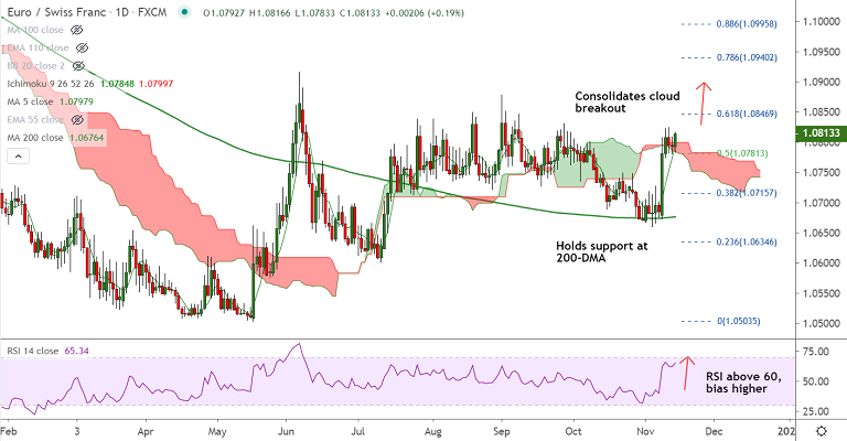 Summary: Pullback in the pair has held support at 200-DMA. The pair is attempting breakout at daily cloud which if successful will propel the pair higher. Next major bull target lies at 1.0846. Retrace below cloud will negate bullish bias.