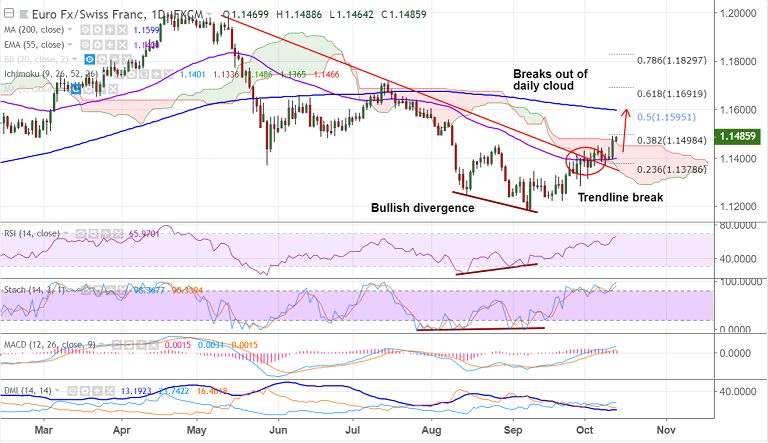 - On the flip side retrace below cloud will see test of 55-DMA at 1.14. Breach at trendline support at 1.1350 negates bullish bias.