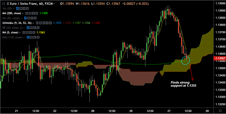 - On the hourly charts, the pair is holding strong support at 1.1355 (converged cloud and 200 SMA).