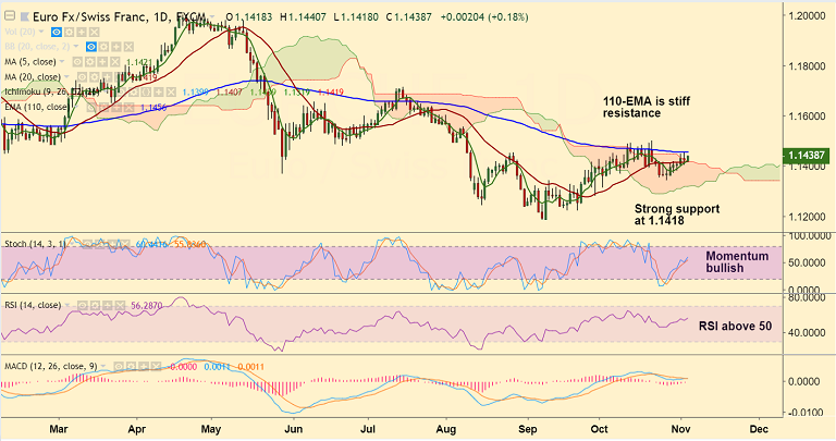 - EUR/CHF finds strong support at 1.1418 (converged 20-DMA and cloud), intraday bias bullish.