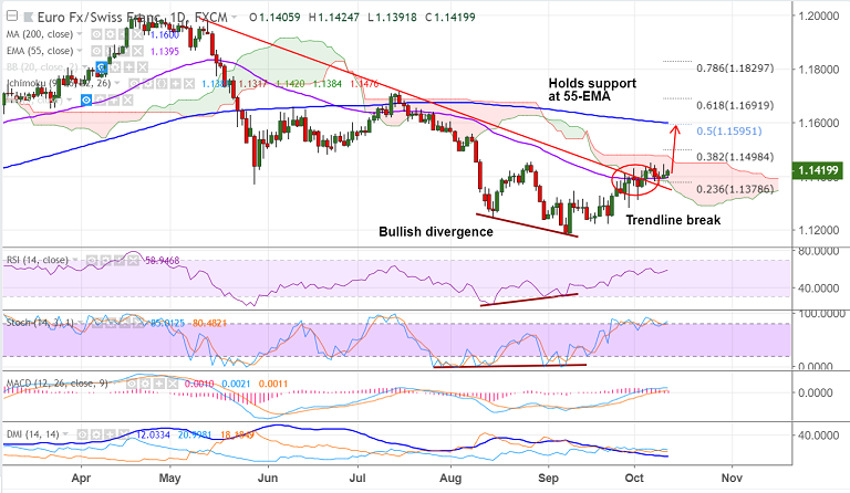 Support levels - 1.1395 (55-EMA), 1.1378 (23.6% Fib), 1.1360 (trendline), 1.1281 (Sept 28 low)