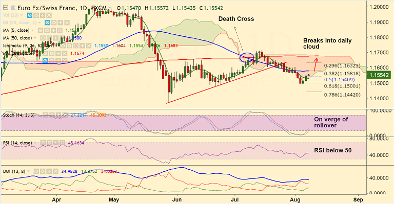 - On the flipside, failure to hold break above 5-DMA could see retrace till 61.8% Fib. Next major bear target below 61.8% Fib lies at 78.6% Fib at 1.1442.
