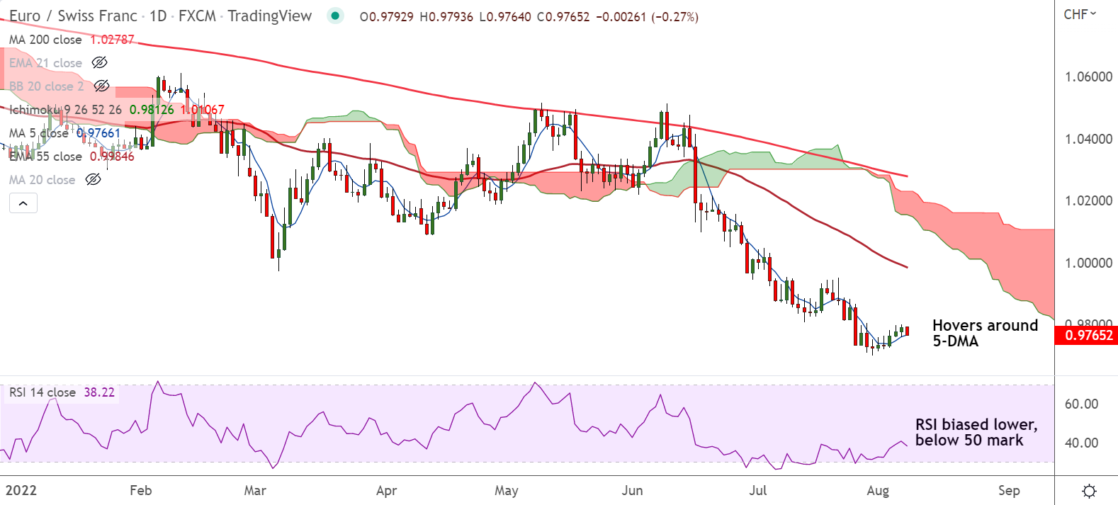 - EUR/CHF has paused a three-day upside streak just below 20-DMA