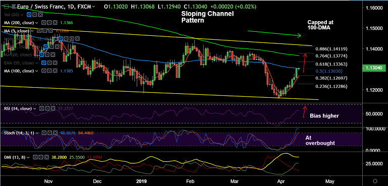 - A bullish 5 and 20 DMA crossover keeps scope for upside. Breakout at 100-DMA will see gains till 61.8% Fib at 1.1336 ahead of 200-DMA at 1.1366.