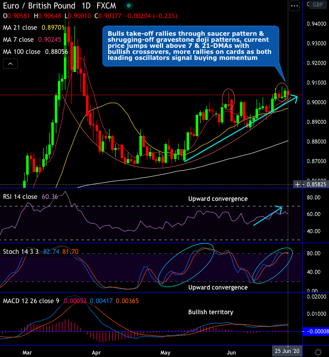 Bulls take-off rallies through saucer pattern & currently, shrugging-off gravestone doji patterns. The current price jumps well above 7 & 21-DMAs with bullish crossovers, for now, more rallies seem to be on the cards as both leading oscillators signal intensified buying momentum.