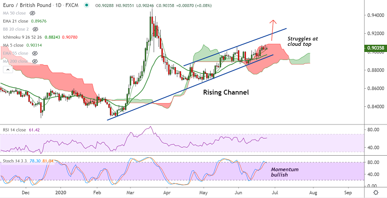 The pair is struggling at cloud top at 0.9078, break out of cloud to see further gains.