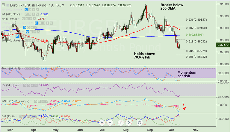 Resistance levels - 0.8757 (5-DMA), 0.8803 (61.8% Fib), 0.8835 (200-DMA)