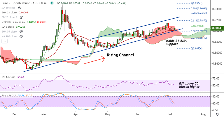 The pair has bounced off strong support at 21-EMA and channel base, scope for further upside.